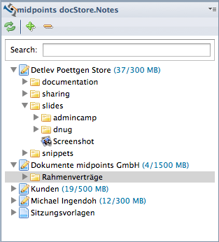 With the HCL Notes doc.Store Sidebar-Plugin the user access his provided storage-container. With these repositories it is possible to set up separated and shared areas for marketing materials, sales materials, minutes or general templates as well. Additionally, one own repository can be assigned to a user for private use.